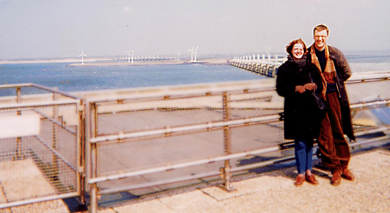 Then we arrived at the storm surge barrier in the Eastern Scheldt. They have a nice visitor's center with informative displays that describes the massive project. Here are Gilda and Hans with the barrier behind them. Notice the windmills on the left. |